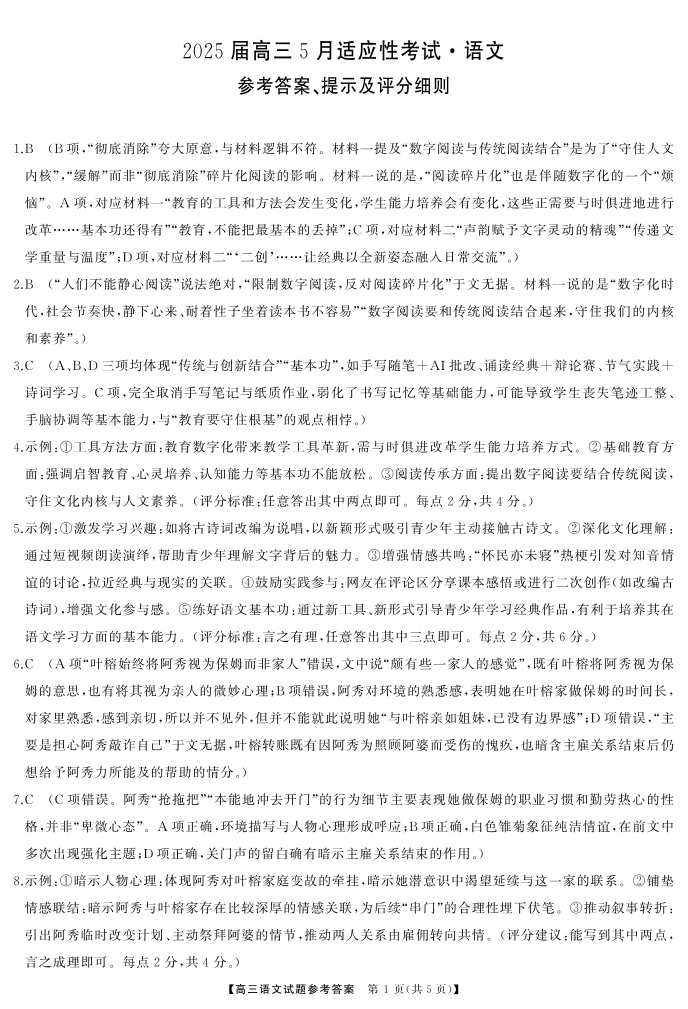 湖南省天壹名校联盟2025届高三5月适应性考试 语文答案.pdf