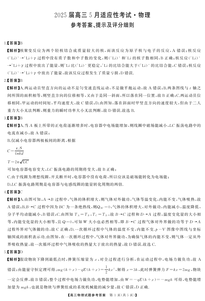 湖南省天壹名校联盟2025届高三5月适应性考试 物理答案.pdf