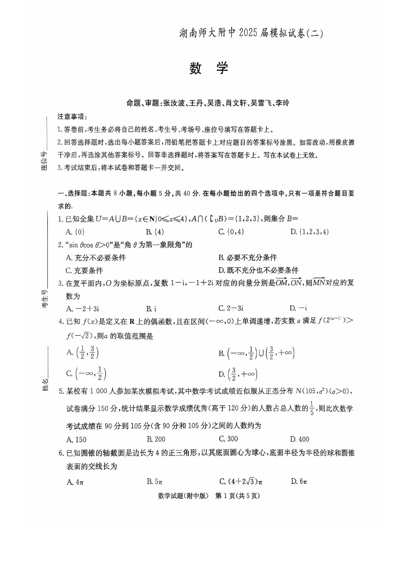 湖南师范大学附属中学2025届高三下学期模拟考试(二)数学(含答案).pdf