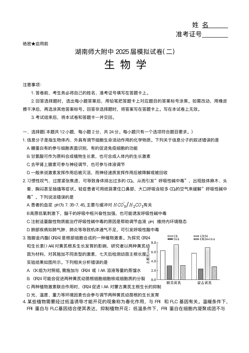 湖南师范大学附属中学2025届高三下学期模拟考试(二)生物(含答案).pdf