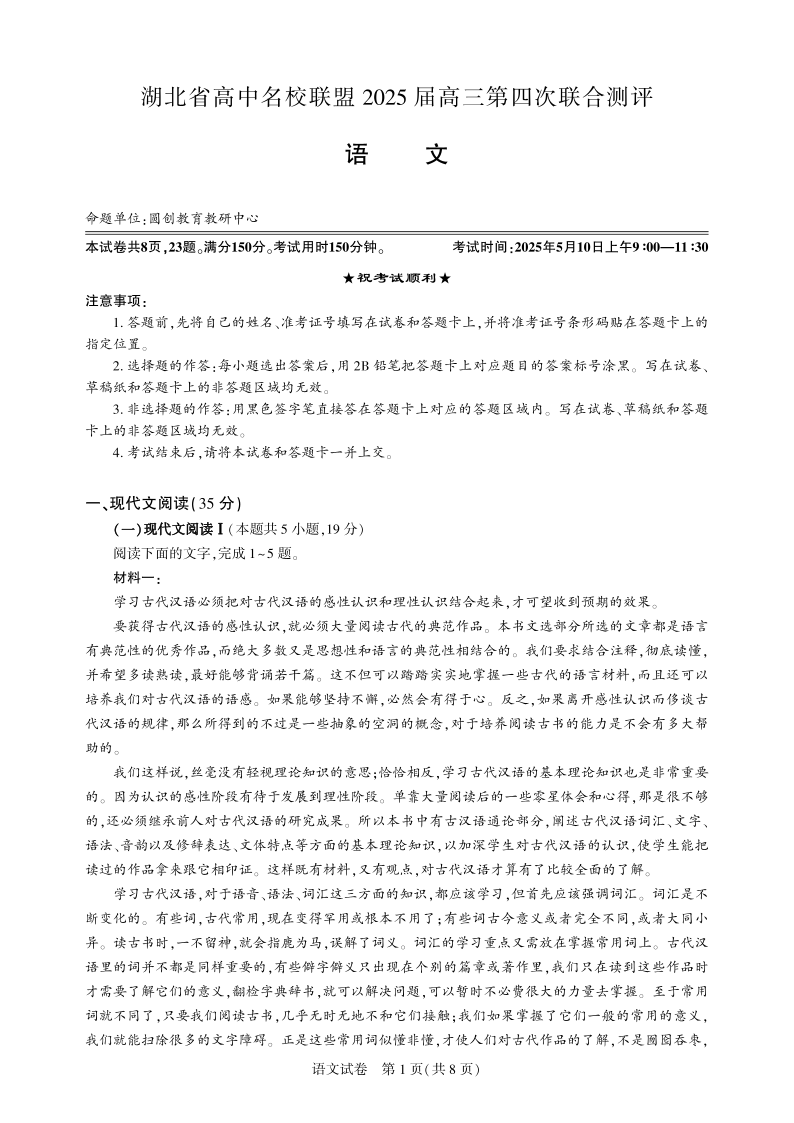 湖北省高中名校联盟2025届高三第四次联合测评 语文.pdf