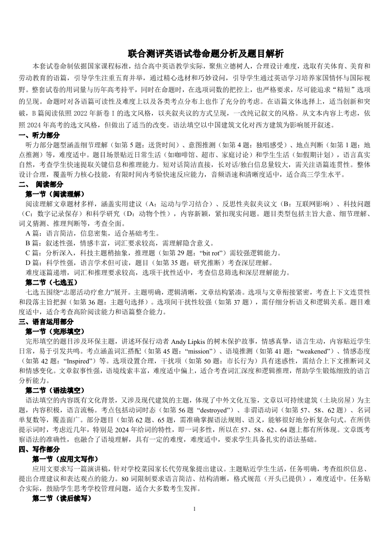 湖北省高中名校联盟2025届高三第四次联合测评 英语试卷命题分析及题目解析.pdf