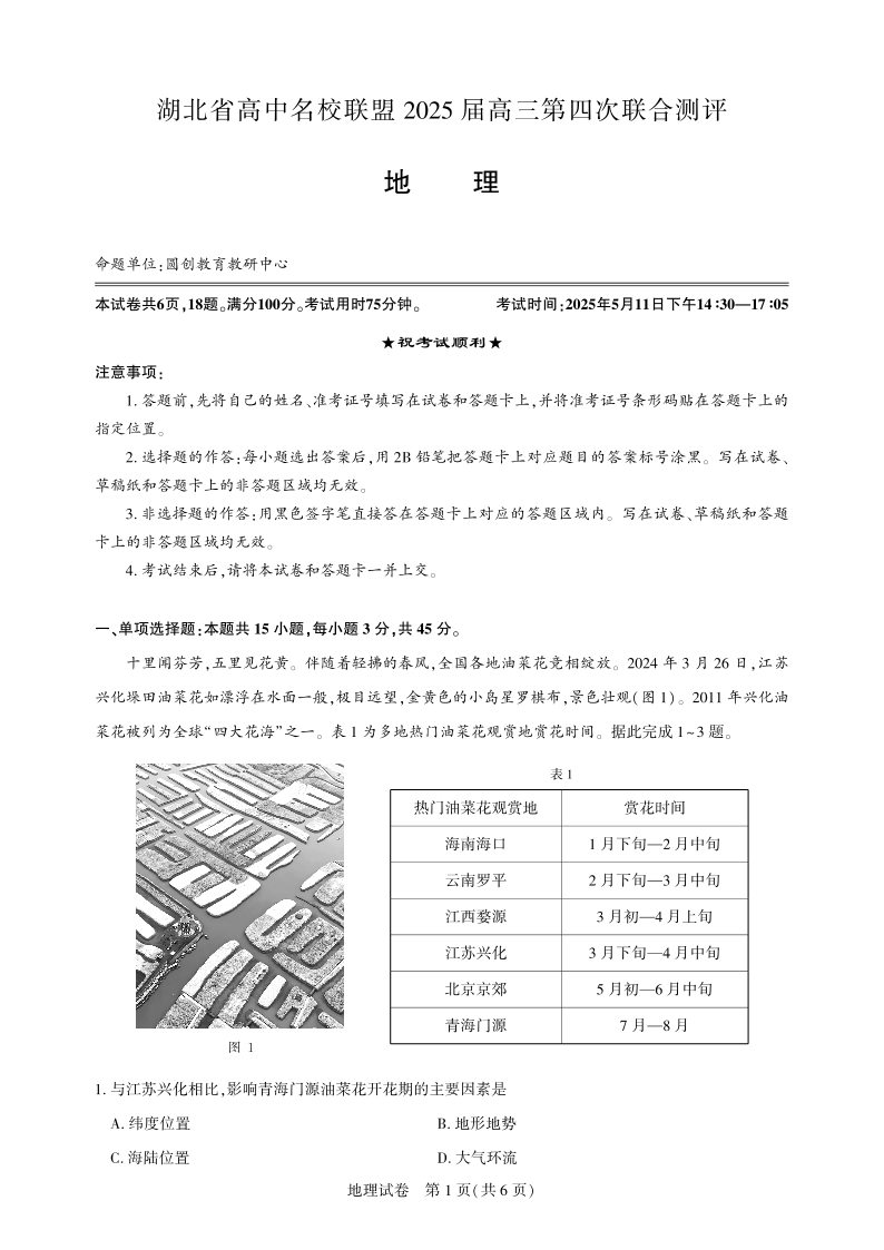湖北省高中名校联盟2025届高三第四次联合测评 地理.pdf