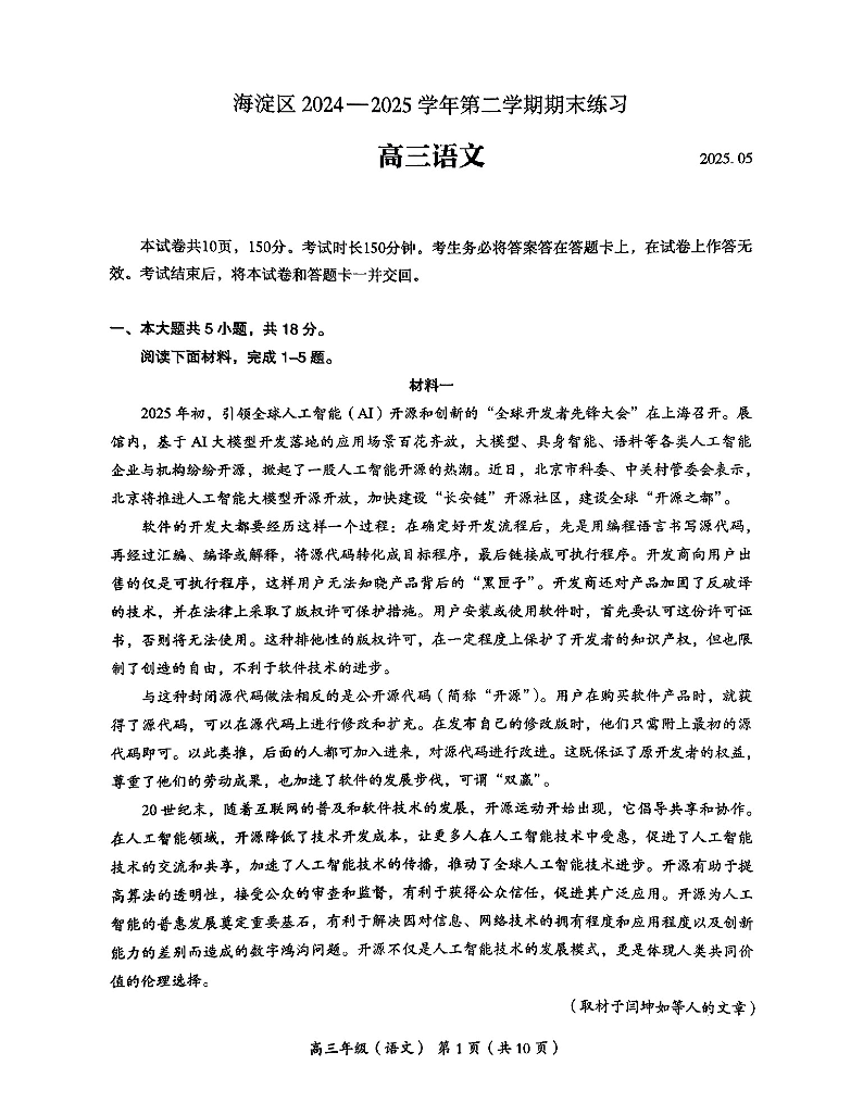 2025年北京市海淀区高三二模-语文(含答案).pdf