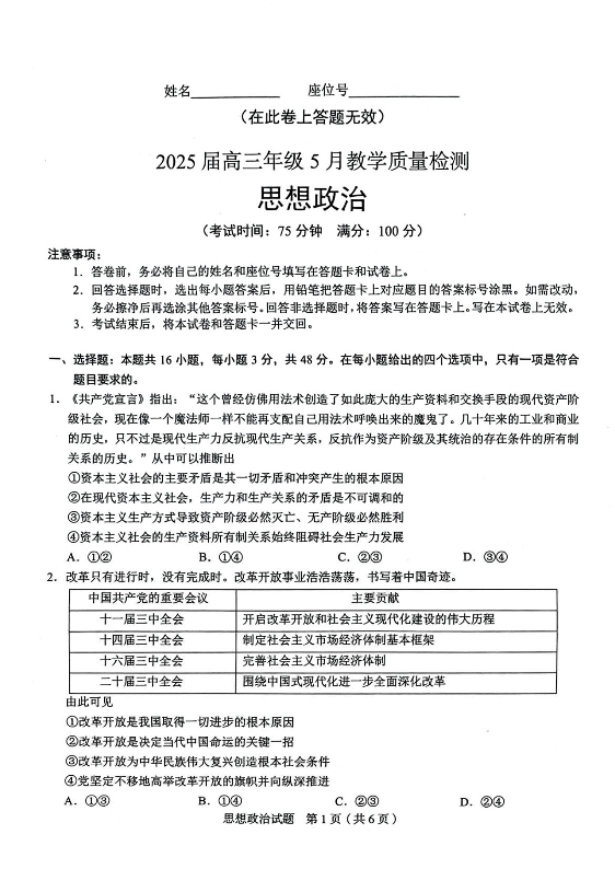 合肥市2025届高三年级5月教学质量检测 政治.pdf
