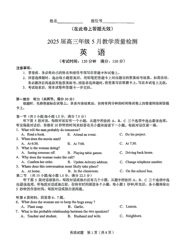 合肥市2025届高三年级5月教学质量检测 英语.pdf