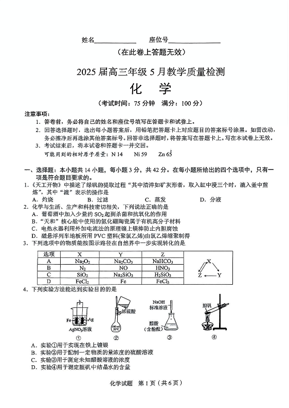 合肥市2025届高三年级5月教学质量检测 化学.pdf