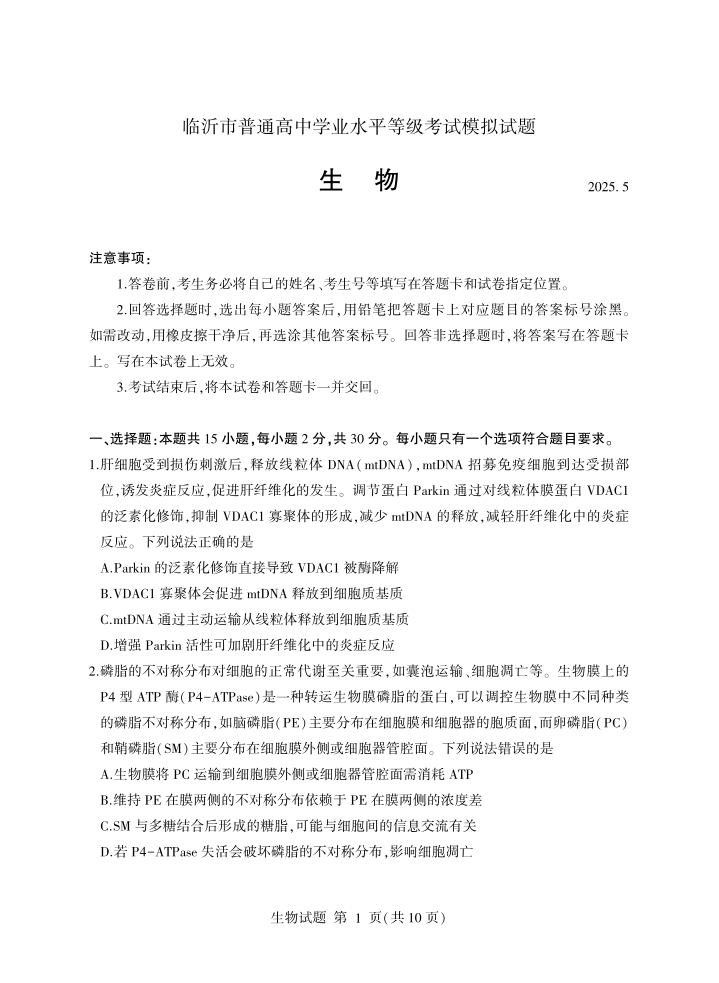 临沂市2025年5月高三第二次模拟考试 生物(含答案).pdf