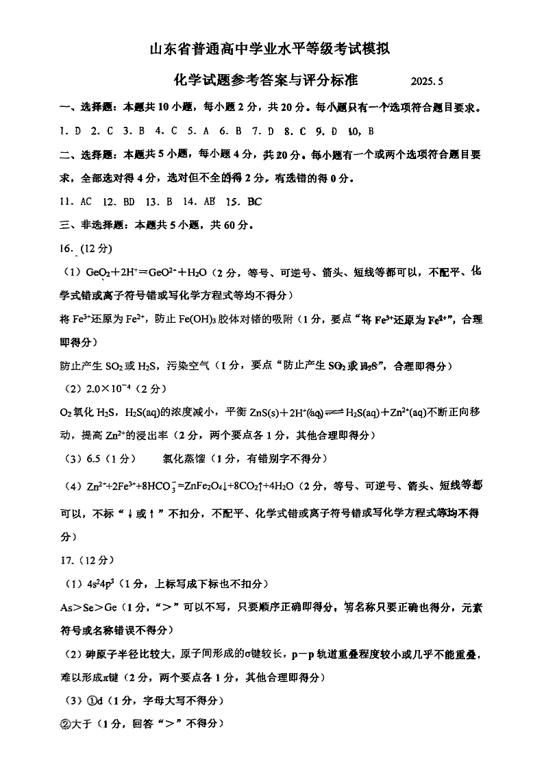 临沂市2025年5月高三第二次模拟考试 化学答案.pdf