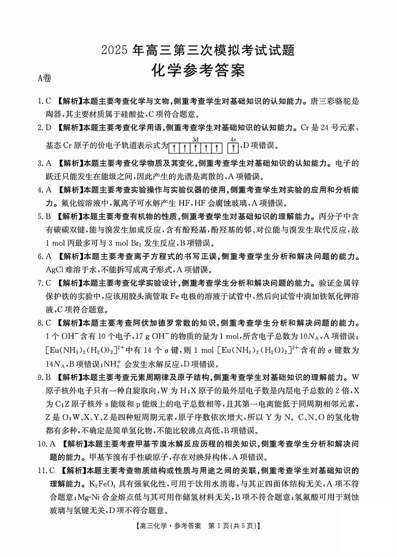 晋城市2025年高三第三次模拟考试 化学答案.pdf