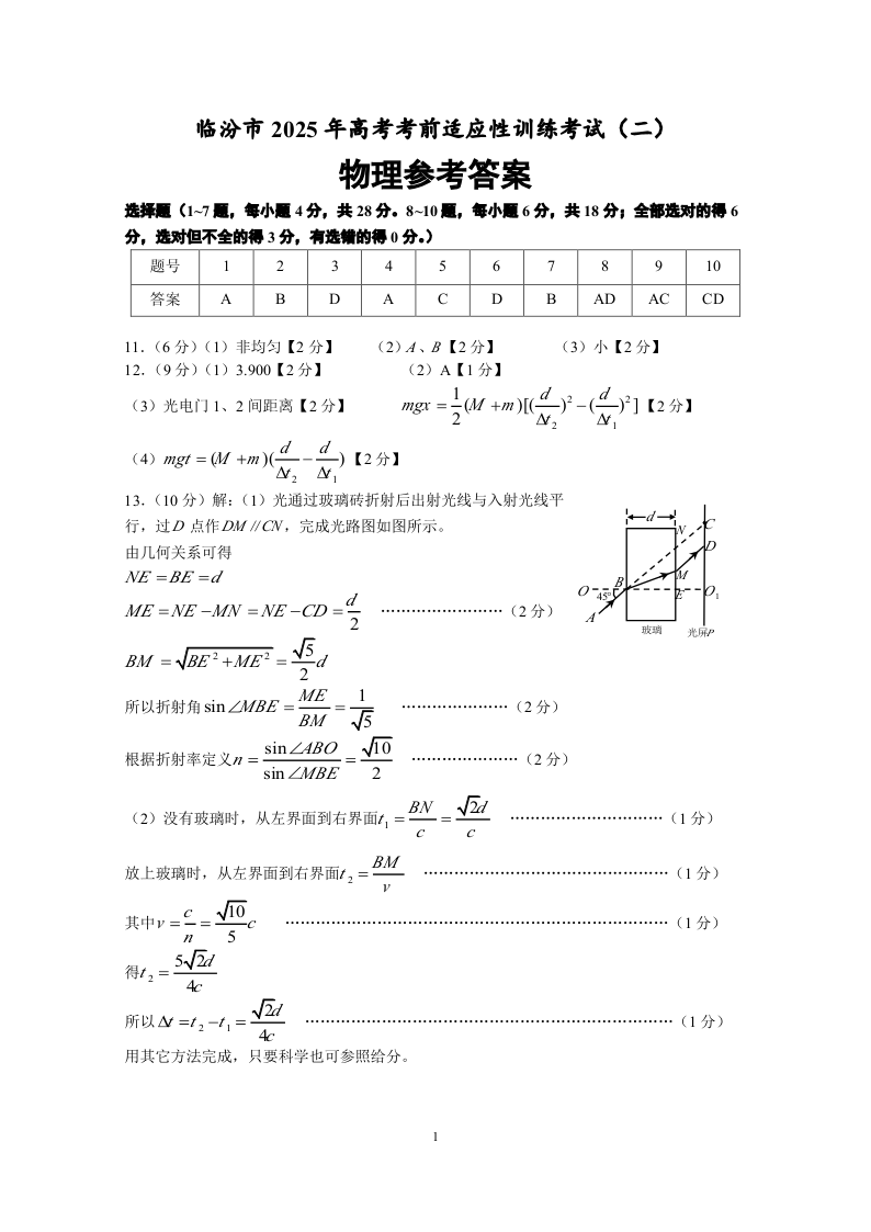 临汾市2025年高考适应性训练考试(二)物理答案.pdf