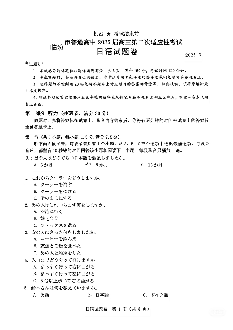 临汾市2025年高考适应性训练考试(二)日语.pdf