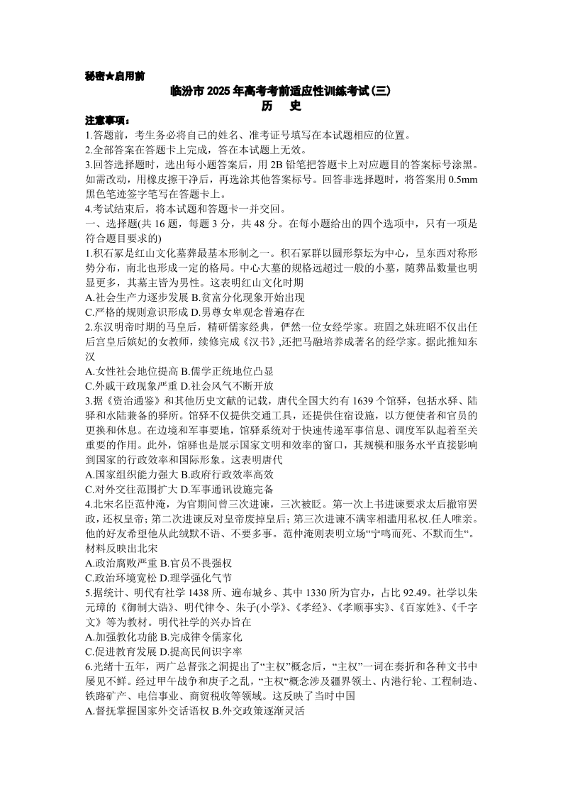 临汾市2025年高考考前适应性训练考试(三) 历史(含答案).pdf