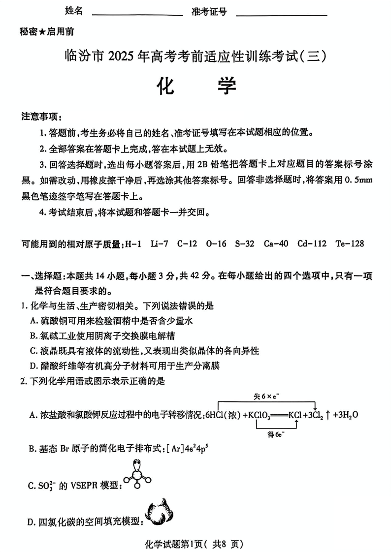 临汾市2025年高考考前适应性训练考试(三) 化学(含答案).pdf