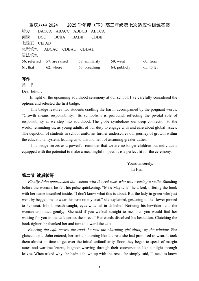 重庆市第八中学高2025届高考适应性月考卷(七)英语答案.pdf