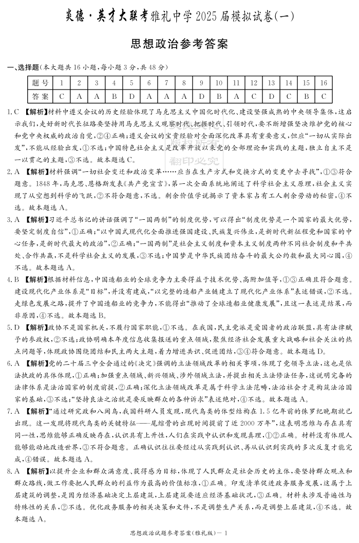 炎德·英才大联考雅礼中学 2025 届模拟试卷(一)政治答案.pdf