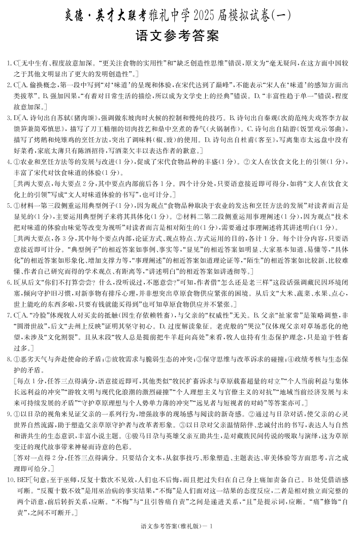 炎德·英才大联考雅礼中学 2025 届模拟试卷(一)语文答案.pdf