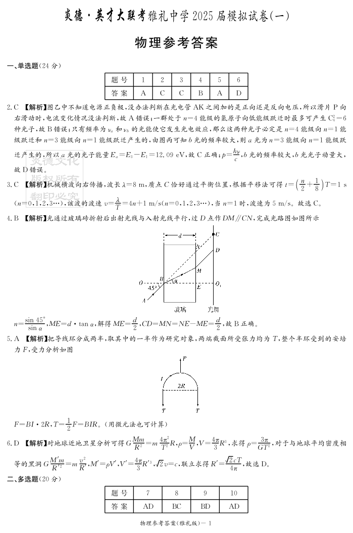 炎德·英才大联考雅礼中学 2025 届模拟试卷(一)物理答案.pdf