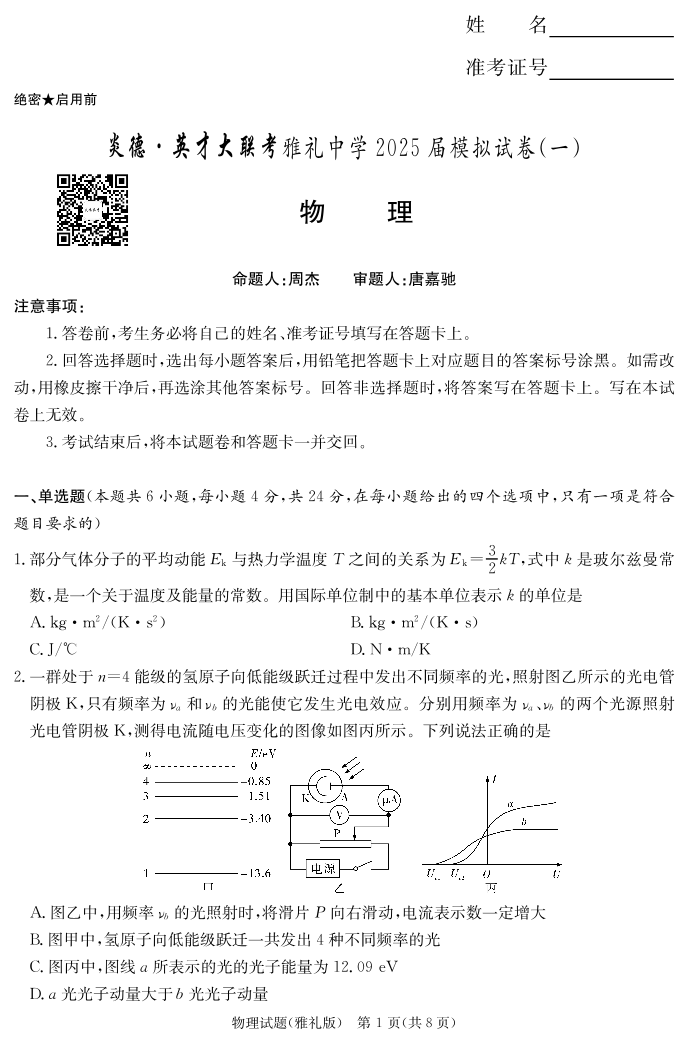 炎德·英才大联考雅礼中学 2025 届模拟试卷(一)物理.pdf