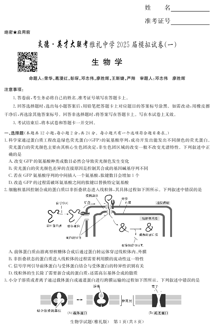 炎德·英才大联考雅礼中学 2025 届模拟试卷(一)生物.pdf