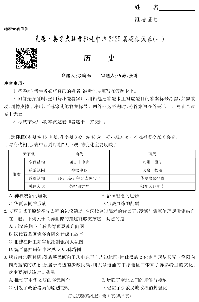 炎德·英才大联考雅礼中学 2025 届模拟试卷(一)历史.pdf