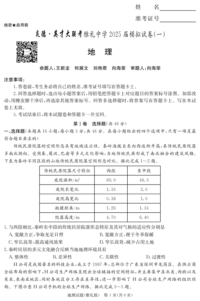 炎德·英才大联考雅礼中学 2025 届模拟试卷(一)地理.pdf