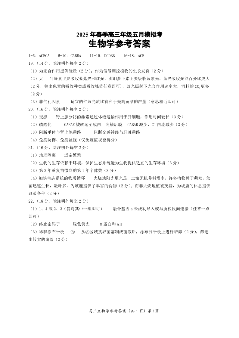 湖北省鄂东南2025年春季高三年级五月模拟考 生物答案.pdf