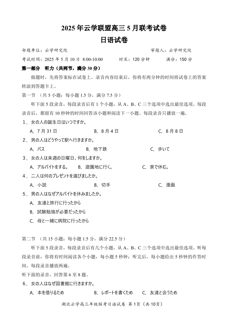 湖北省鄂东南2025年春季高三年级五月模拟考 日语.pdf