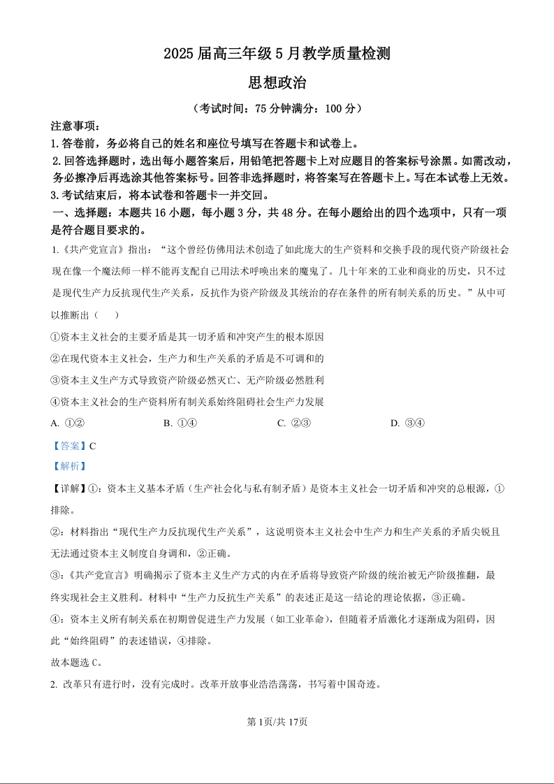 合肥市示范中学2025届高三年级5月教学质量检测 政治答案.docx