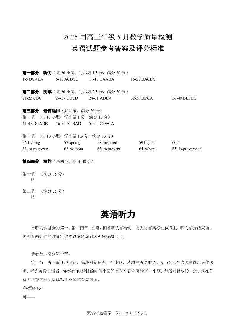 合肥市示范中学2025届高三年级5月教学质量检测 英语答案.pdf
