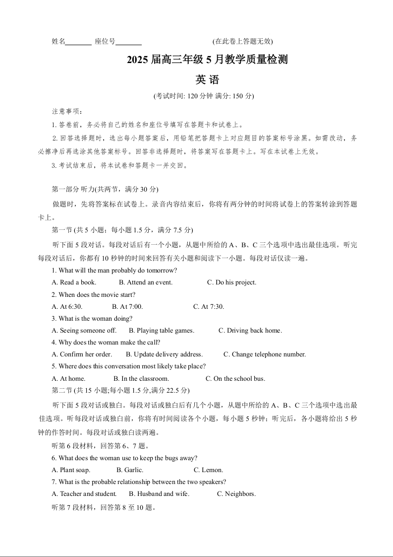 合肥市示范中学2025届高三年级5月教学质量检测 英语.docx