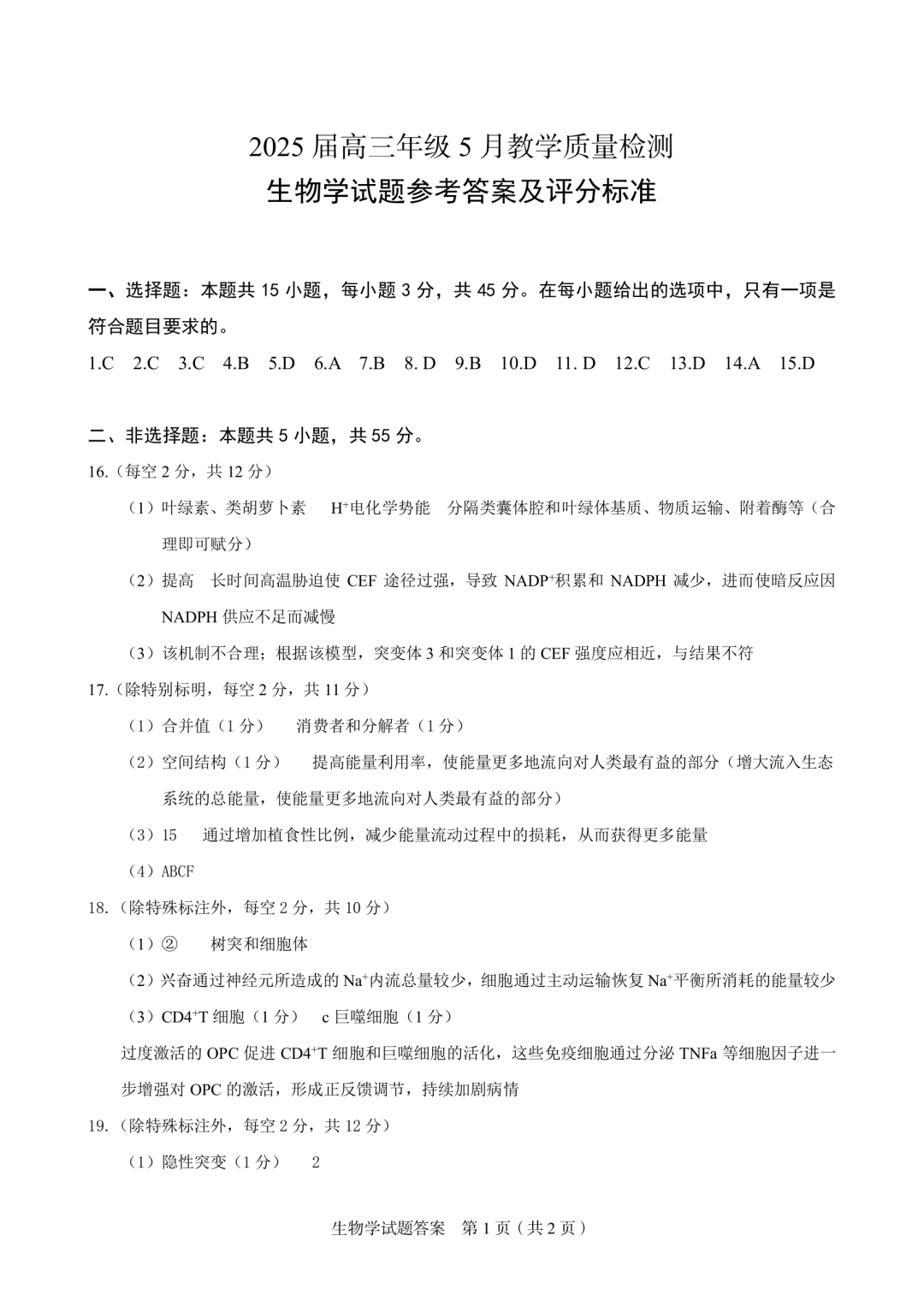 合肥市示范中学2025届高三年级5月教学质量检测 生物答案.pdf