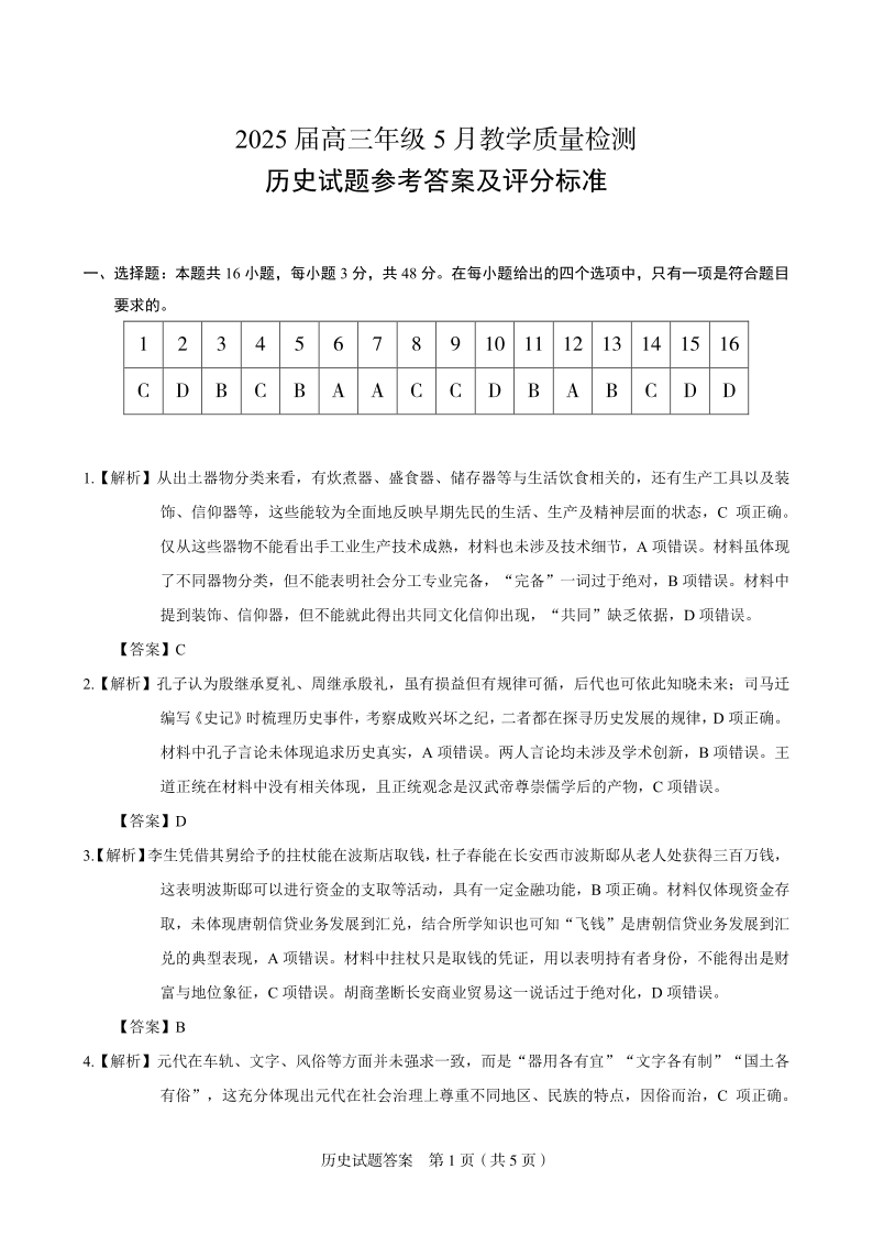 合肥市示范中学2025届高三年级5月教学质量检测 历史答案.pdf