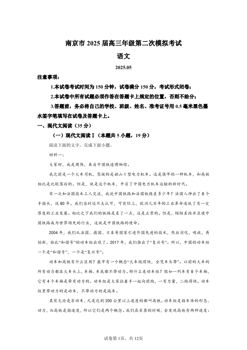 南京市2025届高三年级第二次模拟考试 语文(含答案).pdf
