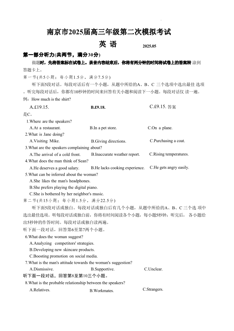 南京市2025届高三年级第二次模拟考试 英语(含答案).pdf