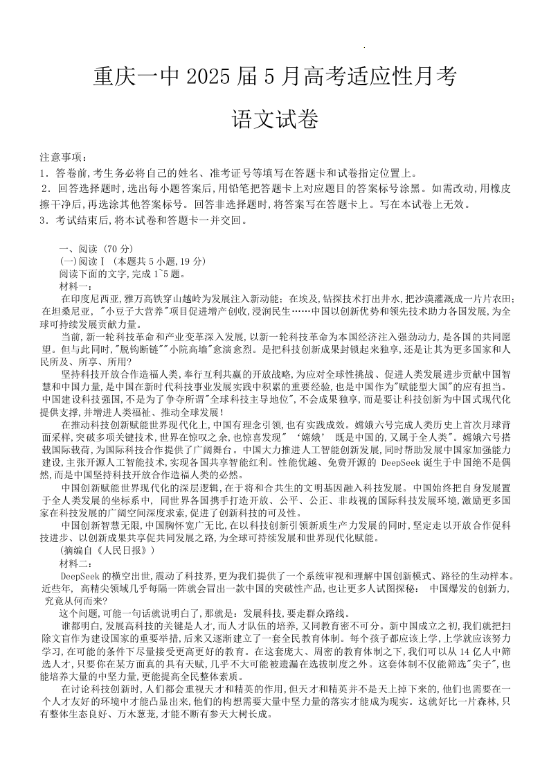 重庆一中2025届5月高考适应性月考卷 语文(含答案).docx
