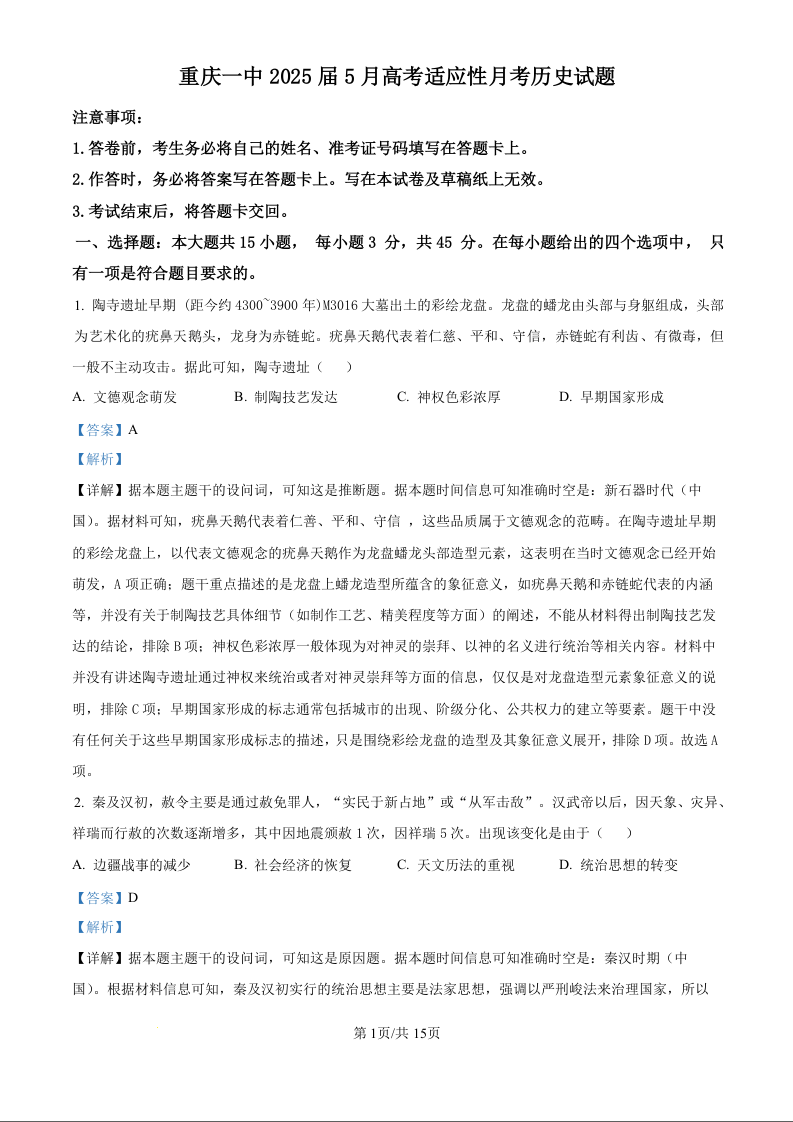 重庆一中2025届5月高考适应性月考卷 历史答案.docx