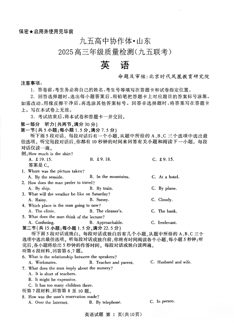 九五高中协作体·山东2025高三年级质量检测 英语.pdf