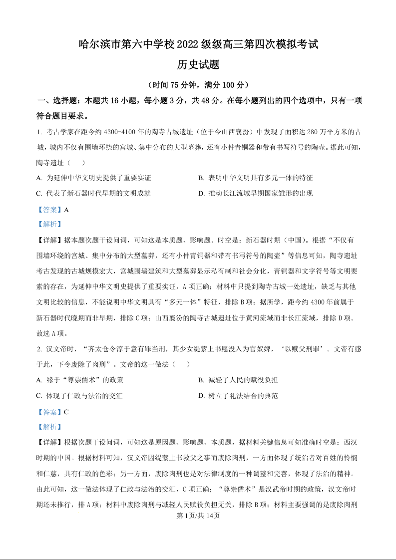哈尔滨市第六中学2025届高三第四次模拟考试 历史答案.docx