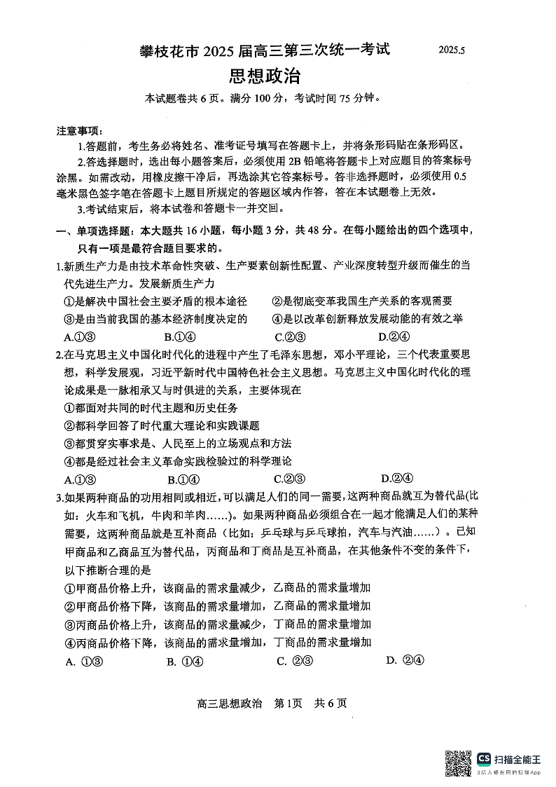 四川省攀枝花市2025届高三第三次统一考试 政治.pdf
