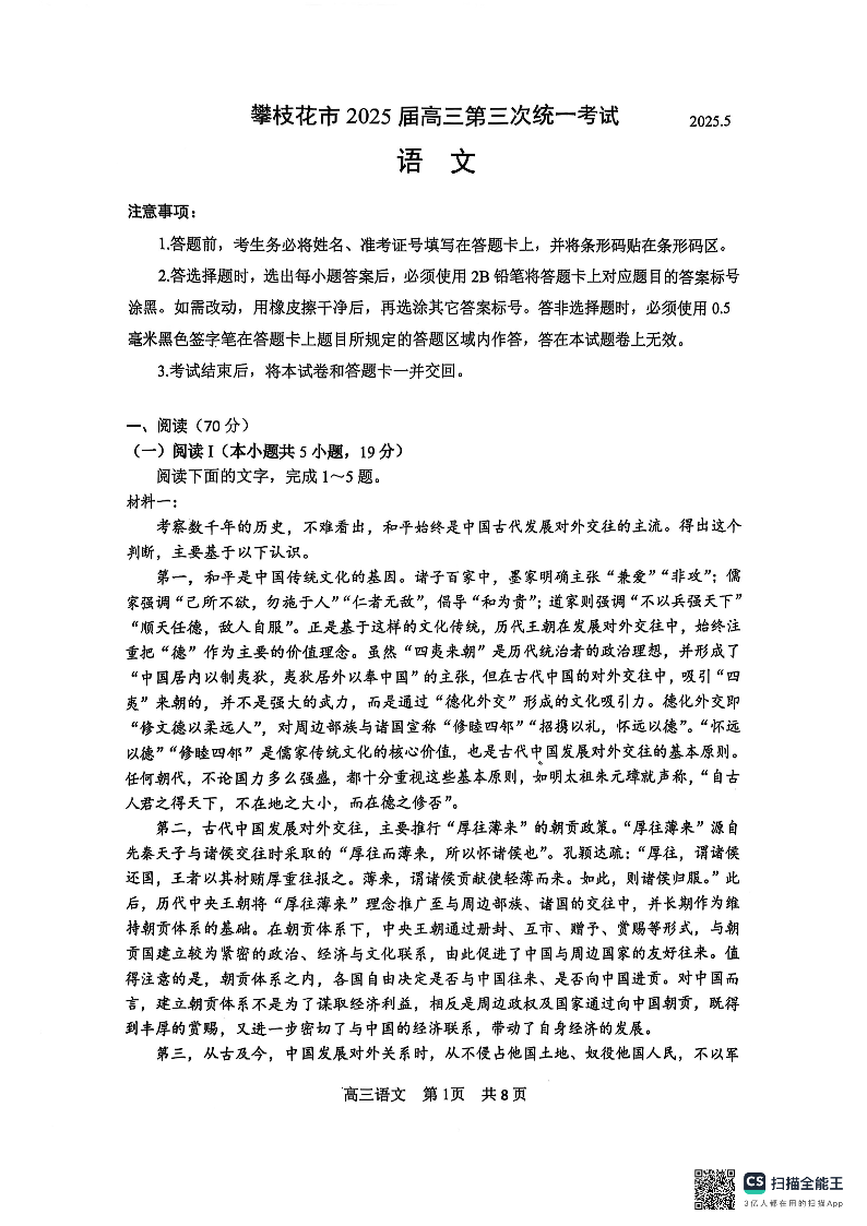 四川省攀枝花市2025届高三第三次统一考试 语文.pdf