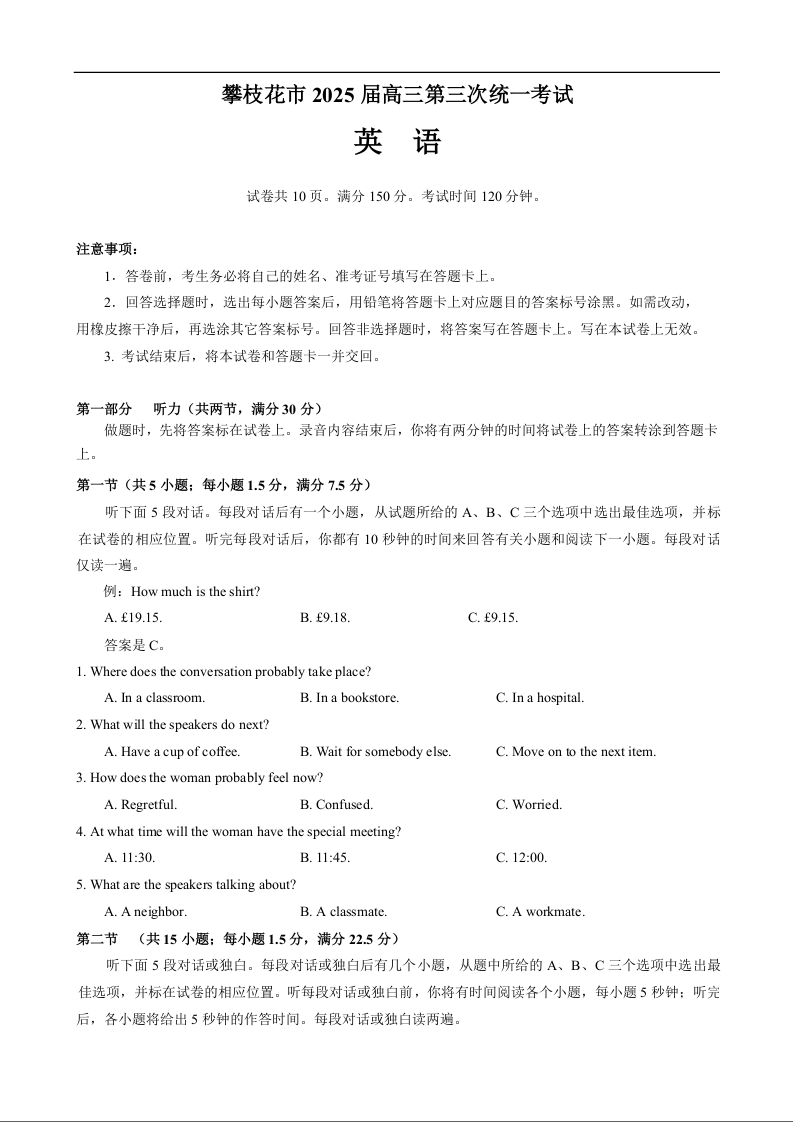 四川省攀枝花市2025届高三第三次统一考试 英语.docx