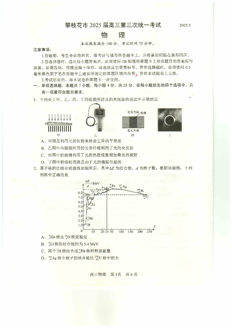 四川省攀枝花市2025届高三第三次统一考试 物理.pdf