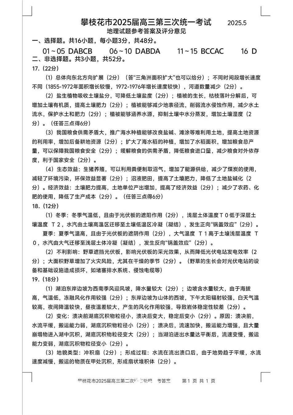 四川省攀枝花市2025届高三第三次统一考试 地理答案.pdf