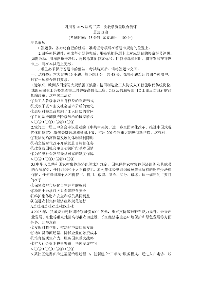 四川省2025届高三第二次教学质量联合测评 政治.docx