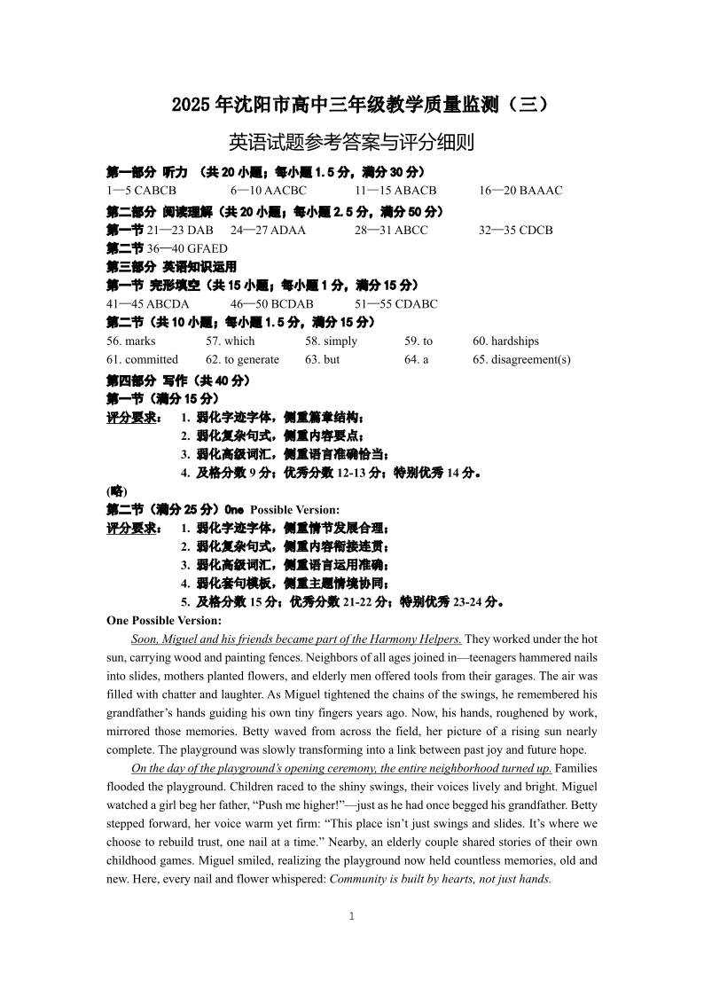 2025年沈阳市高考三模 英语答案.pdf