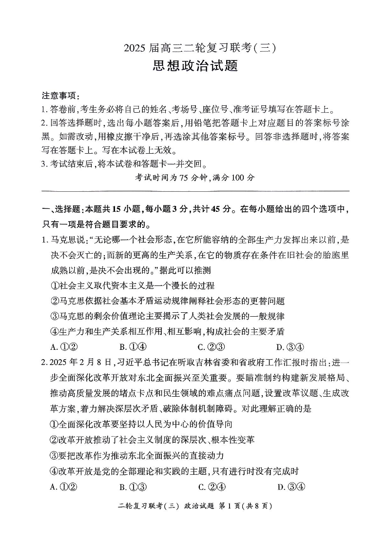 2025届百师联盟高三二轮复习联考(三)政治试题(含答案).pdf