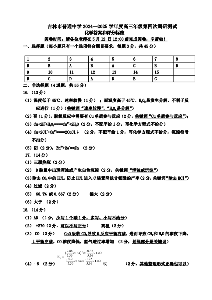 吉林市普通中学2025届高三年级第四次调研测试 化学答案.pdf