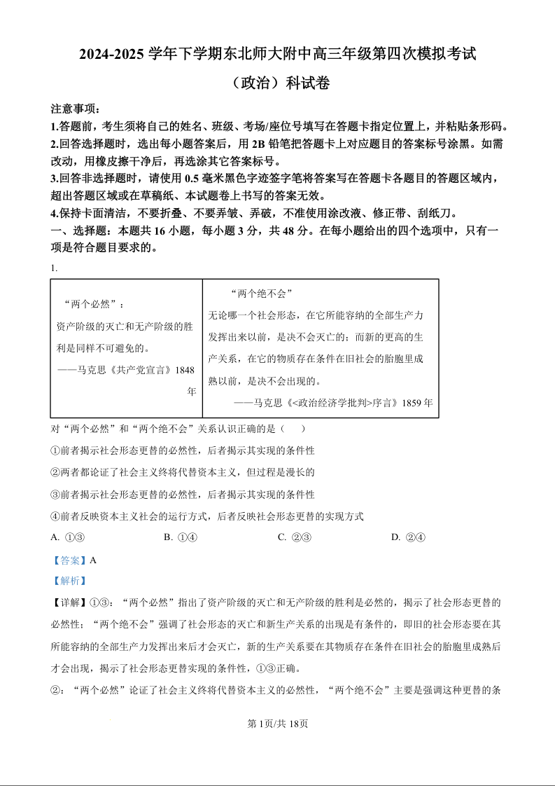 东北师大附中2025届高三年级第四次模拟考试 政治答案.docx