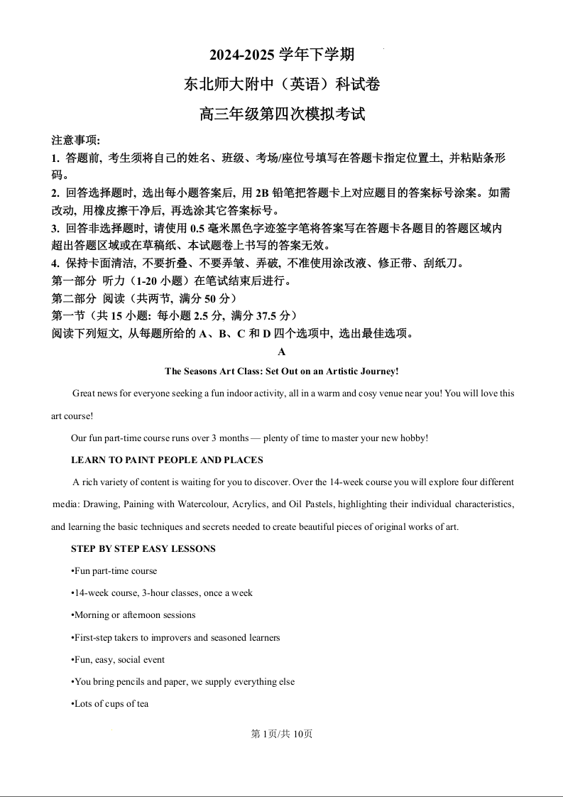 东北师大附中2025届高三年级第四次模拟考试 英语.docx